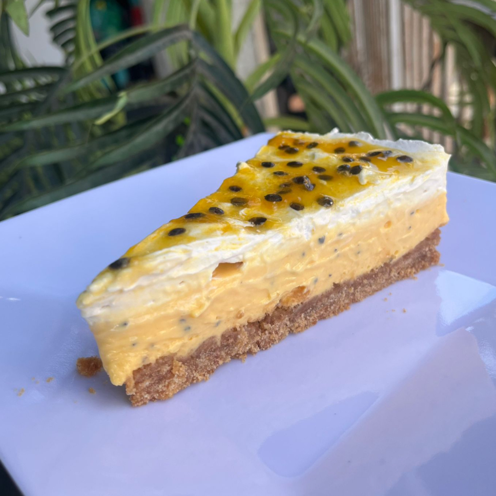 Base de biscoito, musse de maracujá batido com a própria fruta, finalizado com chantilly e geleia artesanal de maracujá.