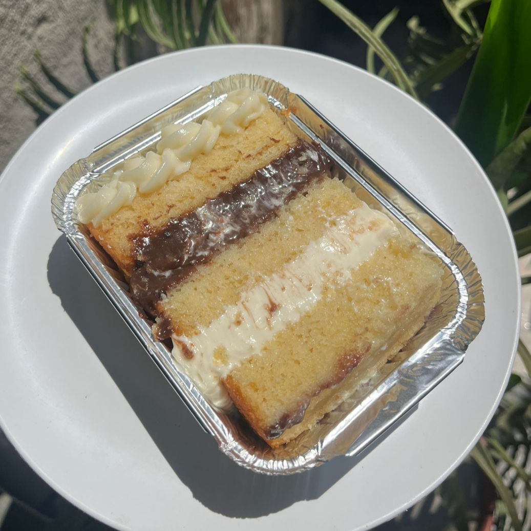 Fatia festa feita em massa de bolo branca , com camada de recheio cremoso de leite ninho, camada de recheio cremoso de chocolate, finalizado com chantininho.