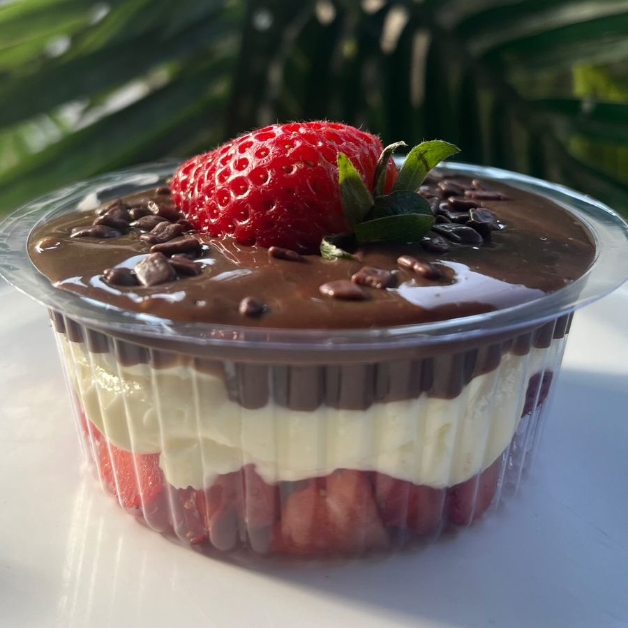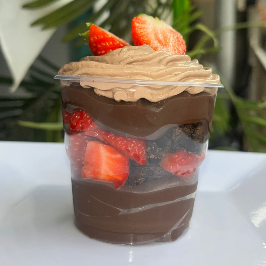 Copo supremo Chocolatudo acompanha camadas de brigadeiro de chocolate cremoso, pedaços de Brownie, pedaços de morango, finalizado com musse de chocolate por cima.