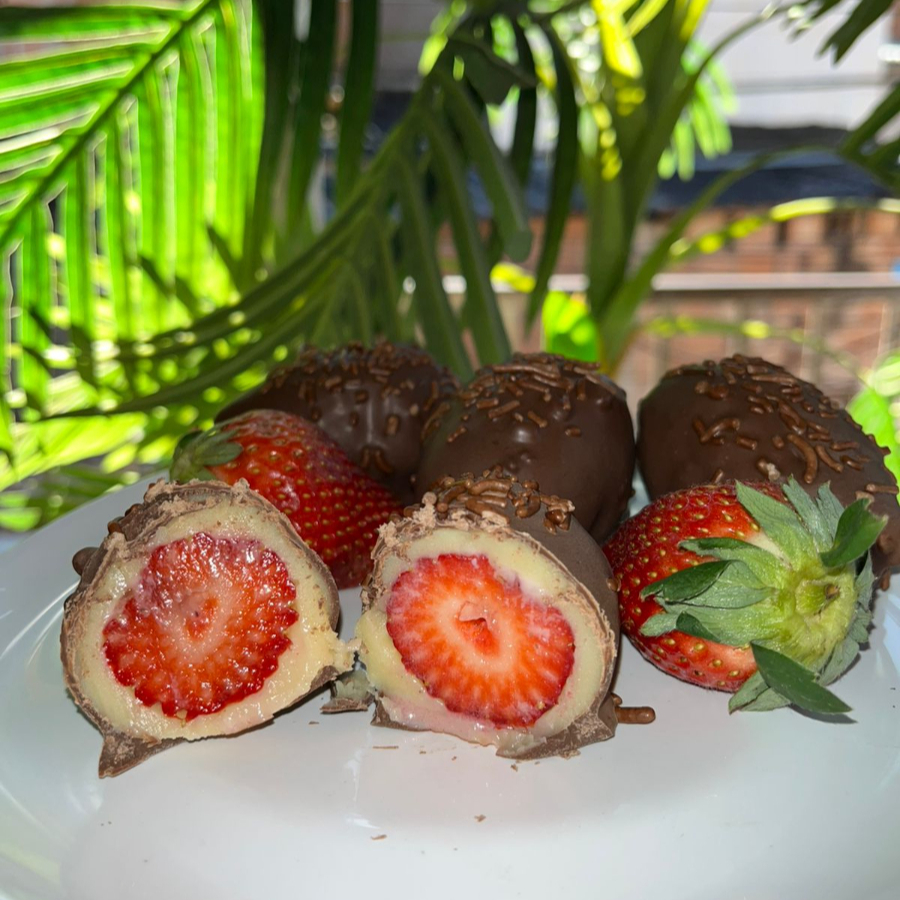 Feito com morango enrolado ao brigadeiro de leite ninho, finalizado com uma leve casquinha de chocolate