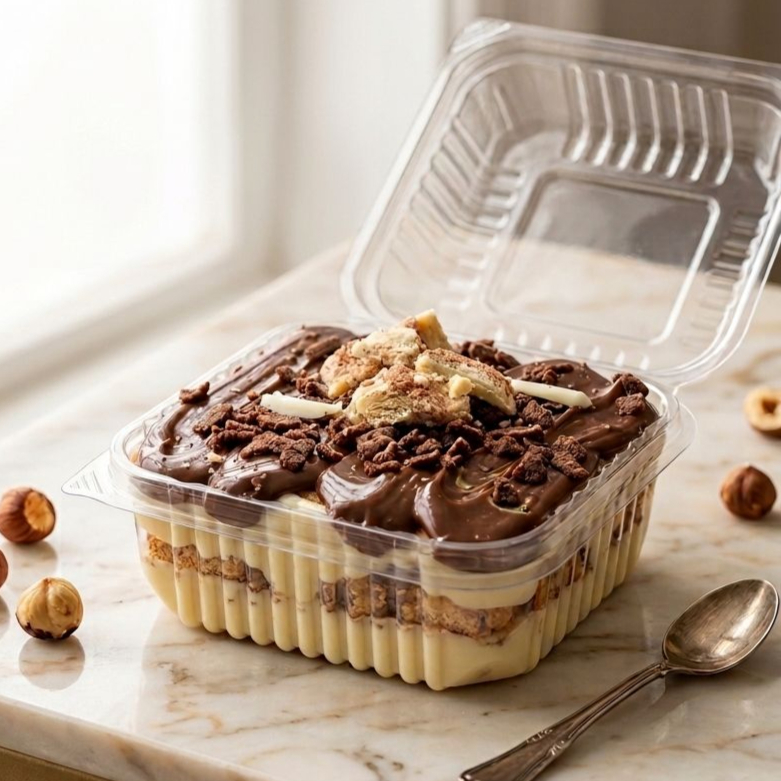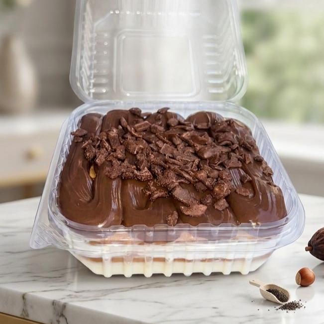 Camadas cremosas e aveludadas de creme de leite ninho intercaladas com biscoito levemente umedecidos, Coberto com uma generosa camada de chocolate ao leite , decorado com granulado em flocos crocante, uma sobremesa indulgente e equilibrada, perfeita para amantes de clássicos .