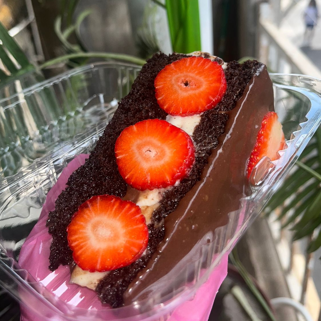 Massa de bolo de chocolate 50% cacau, recheio cremoso de doce de leite ninho, uma leve camada de ganhache de chocolate ao meio, pedaços de morango, finalizado com ganache de chocolate por cima.