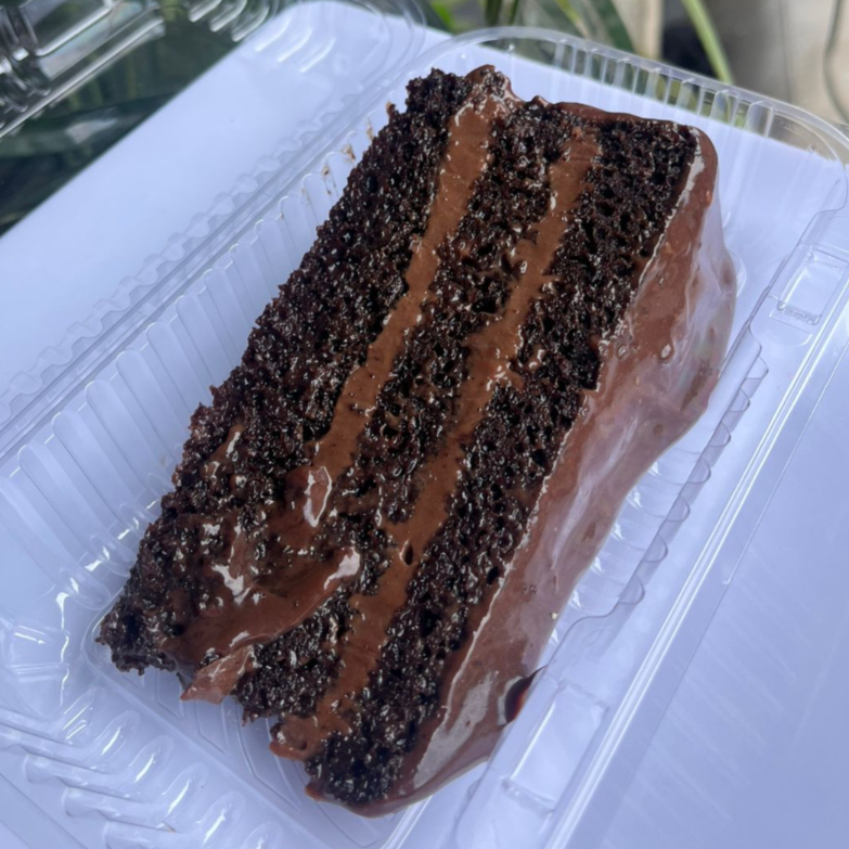 Fatia Matilda Cake acompanha massa de bolo de chocolate 50% cacau, camadas de recheio de chocolate cremoso , finalizado com ganache de chocolate e calda estra de chocolate por cima.