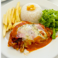 Bife de Frango, Arroz Branco ou Com Alho, Batata Frita e Salada