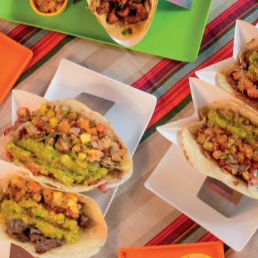 Tortilla macia, 100g de carne em cubos grelhada, muçarela e pico de gallo e guacamole - A pimenta é servida separadamente.