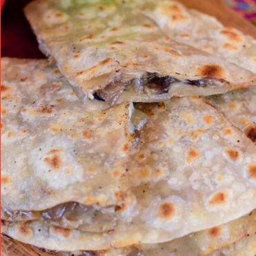 Dupla tortilha de trigo ou milho, muçarela, cogumelos frescos à mexicana e pico de gallo e guacamole - A pimenta é servida separadamente.