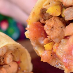 Tortilha de trigo artesanal recheada com frango desfiado tinga, cheddar, queijo muçarela, sour cream e pico de gallo.