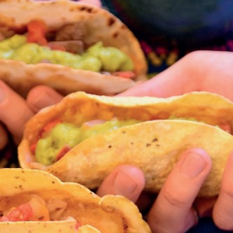 Tortilha macia, muçarela, cheddar, cebola grelhada e pico de gallo. Inclui guacamole. A pimenta é servida separadamente.