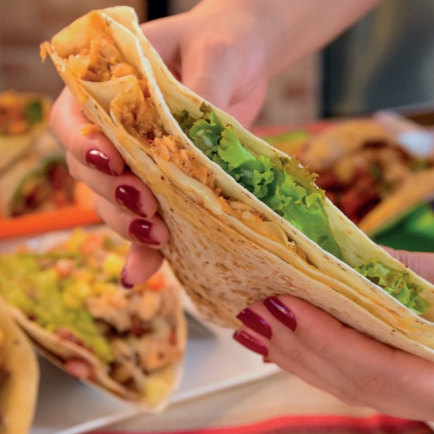 Tortilla macia, 100g de carne em cubos grelhada, muçarela, bacon, mix de cebola e pimentões e pico de gallo e guacamole - A pimenta é servida separadamente.