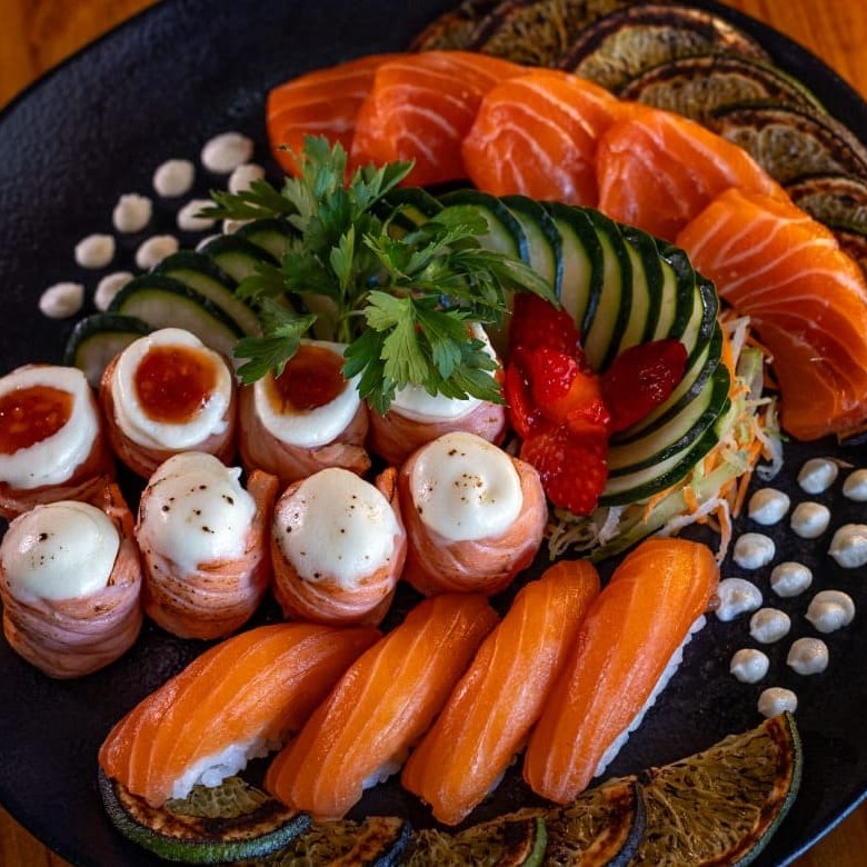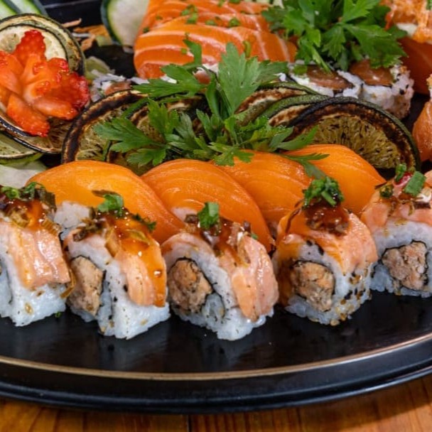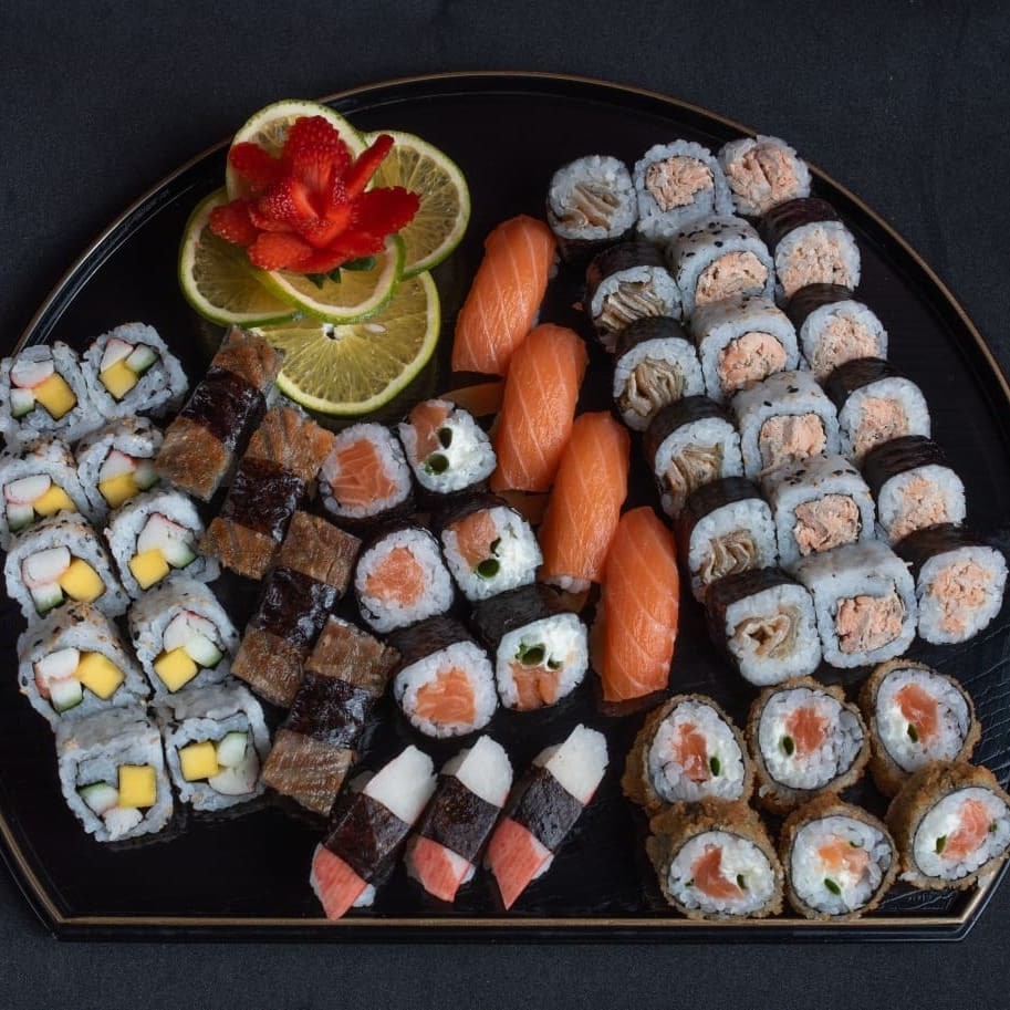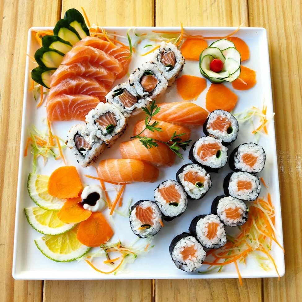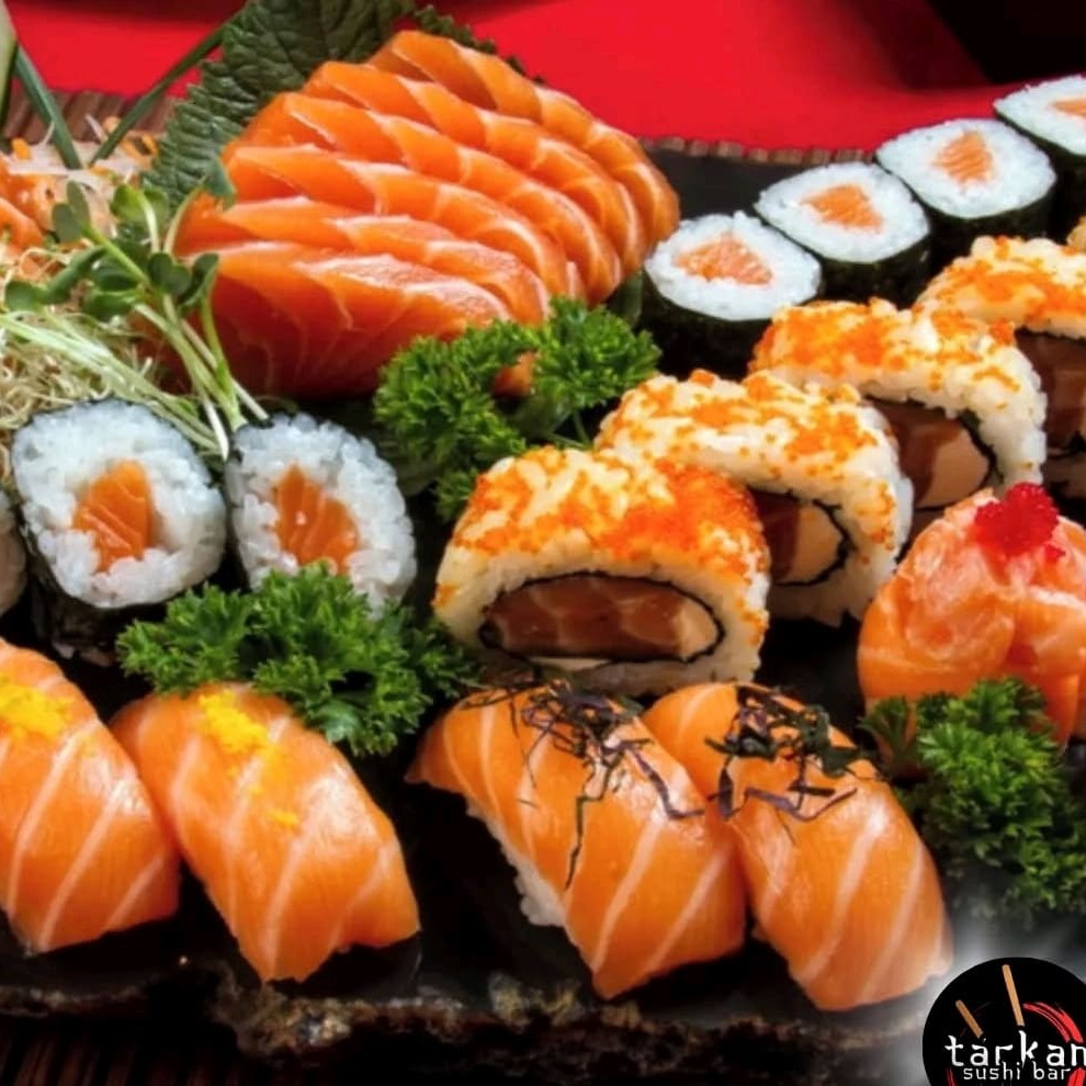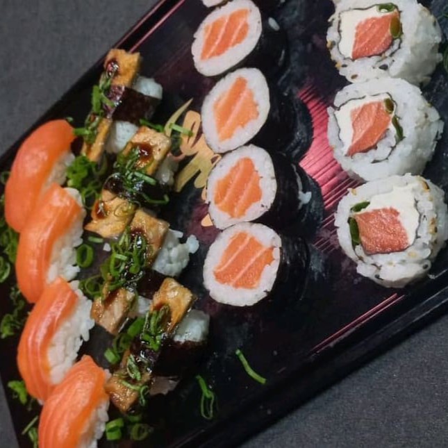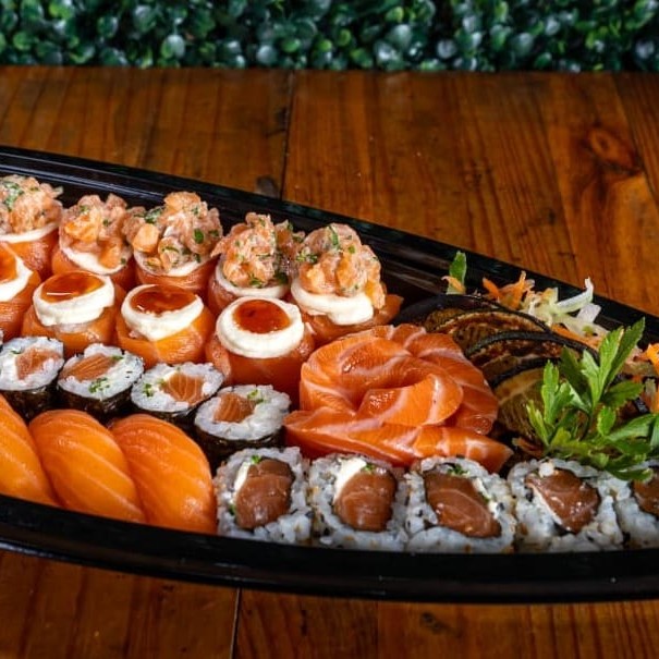 5 mak salmão, 5 uramak filadelfia, 6 sashimi de salmão fresco, 10 deliciosos tarkan mak gurmet, 5 gunka joy Filadélfia, 4 unidades niguiri de salmão