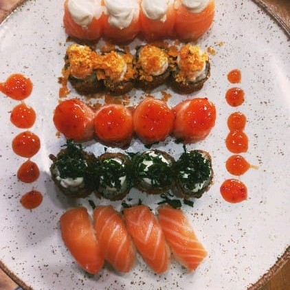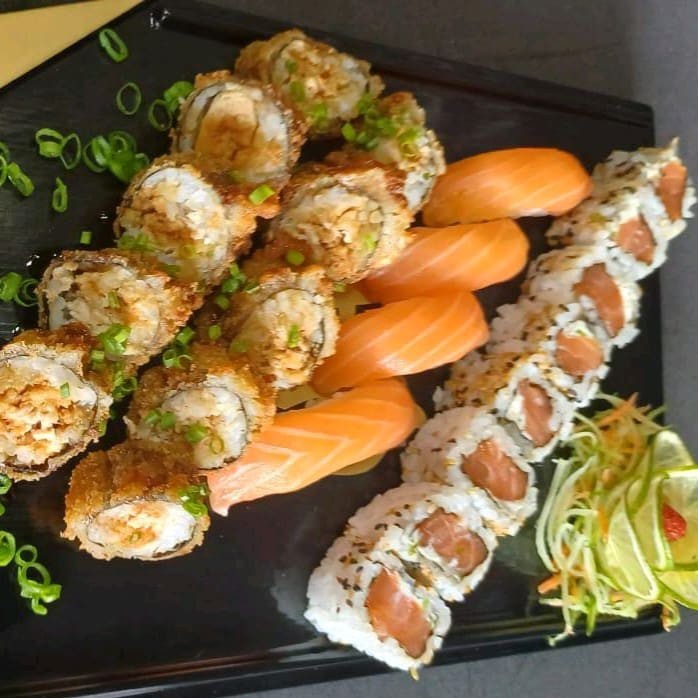 Pra Você!!! Quantidade: 40 peças 8 Uramak Salmão Grelhado 8 Uramaki com Crispy de Couve 8 Maki Salmão Grelhado 8 Uramaki Skin 8 Uramaki com Geleia Sweet Não Acompanha Molhos e Descartáveis. (São vendidos à parte molhos e descartáveis) #sushi#comidajaponesa#sashimi#niguiri#japa#temaki#hot##japonesa #chinesa #shoyo #salmão #camarão #suhi #yakisoba