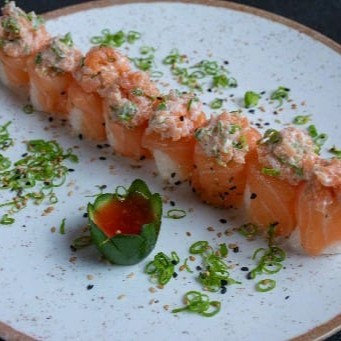 8 unidades Bolinho de Arroz Envolto em Lâmina de Salmão, Recheado com Cream Cheesee Salmão ao Topo e finalizado com Cebolinha Não Acompanha Molhos e Descartáveis. (São vendidos à parte os molhos e descartáveis) #sushi#comidajaponesa#sashimi#niguiri#japa#temaki#hot##japonesa #chinesa #shoyo #salmão #camarão #suhi #yakisoba