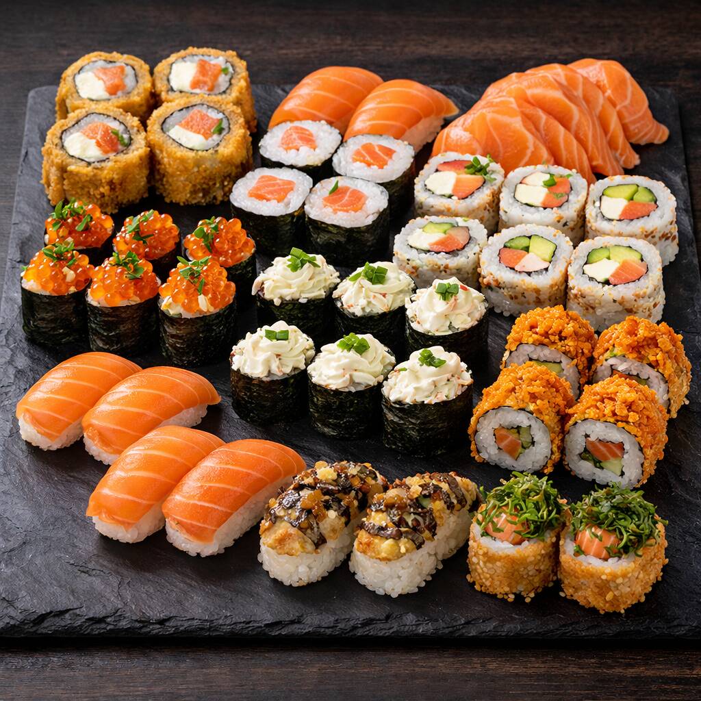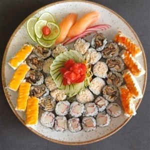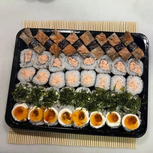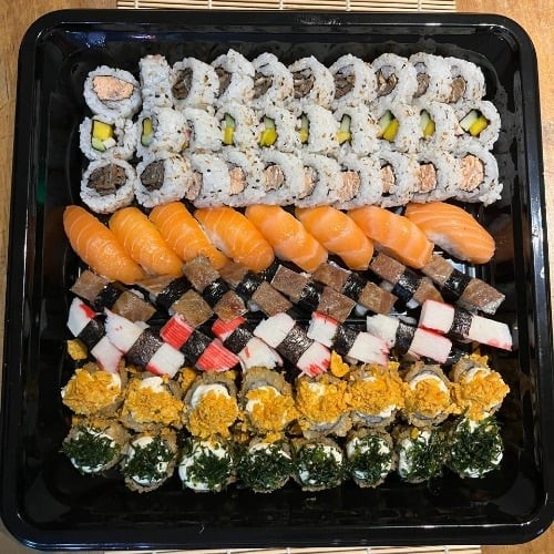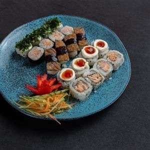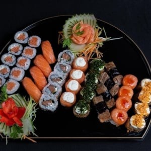 5 mak samão ,5 uramak filadelfia , 6 sashimi de salmão fresco ,10 deliciosos tarkan mak gurmet , 5 gunka joy Filadélfia 4 unidades niguiri de salmão