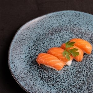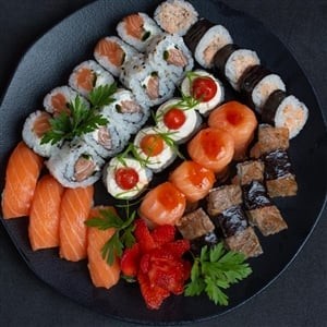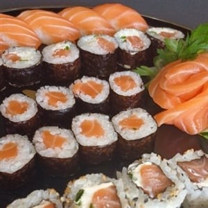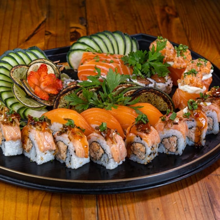 5 maki filadelfia, 5 maki salmão, 4 sashimi de salmão, 4 niguiri de salmão e 5 ura filadelfia.