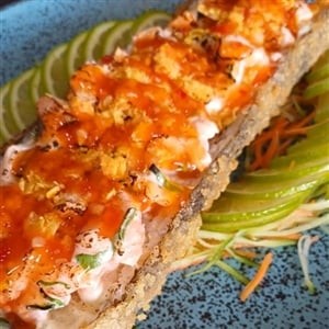 8 unidades salmão maçaricado recheado com camarão e cream cheese.
