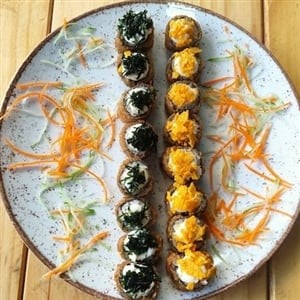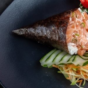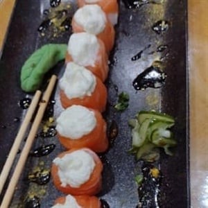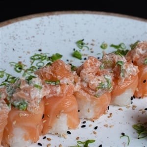 4 unidades de enrolado de arroz com gergelim, salmão cream cheese.