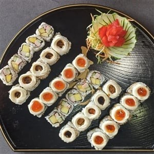 não acompanha molhos e hashi! 2 niguiri salmão, 10 salmão grelhado, 5 tortinha sweet, 5 tortinha cheddar, 10 mak kani e 10 mak iskin.