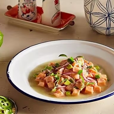 Fomos até o Peru para buscar a receita do autêntico Ceviche! Servido em duas opções - misto (salmão, camarão, polvo e peixe branco) e somente salmão - ambos são deliciosamente marinados em suco de limão siciliano, preparados com cebola roxa cortada em finas fatias e temperados com saborosas especiarias.