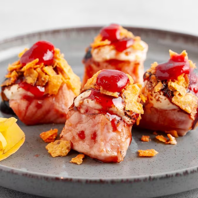 Salmão em cubos maçaricado com cream cheese, finalizado com molho teriaki especial, geléia de morango e Doritos