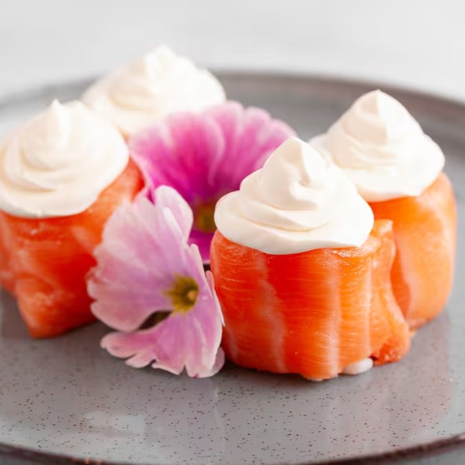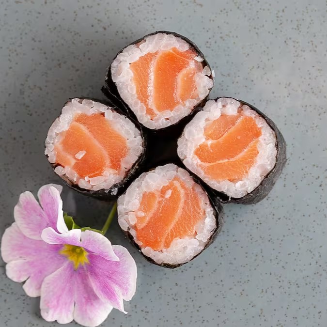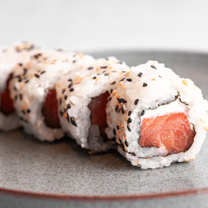 Bolinho de arroz envolto por peixe, finalizado com ingredientes especiais