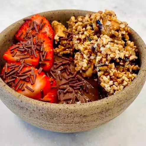 O equilíbrio perfeito entre a dose diária de doce e de proteína. Feito sem nenhuma adição de açúcar, finalizado com raspas de chocolate e morangos frescos.