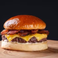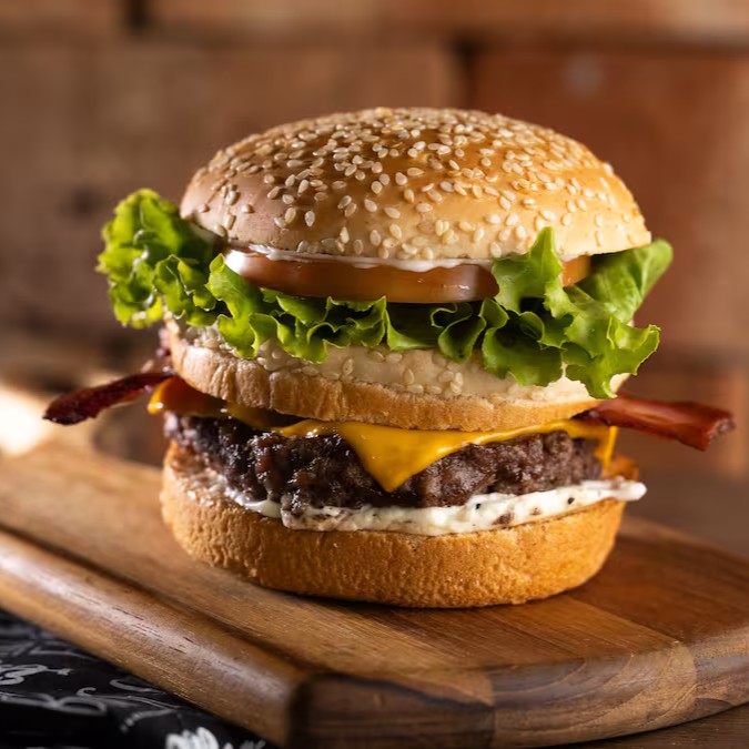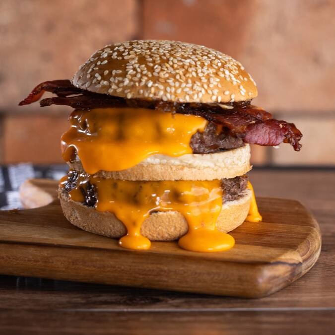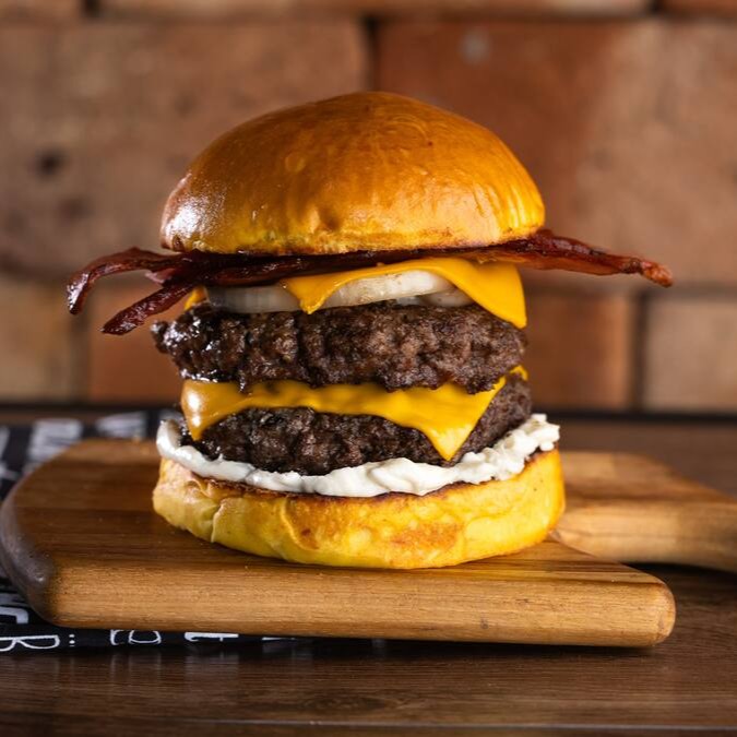Pão Brioche selado, molho da casa, 2x blend bovino 150g, queijo cheddar, cebola marinada, bacon e molho barbecue