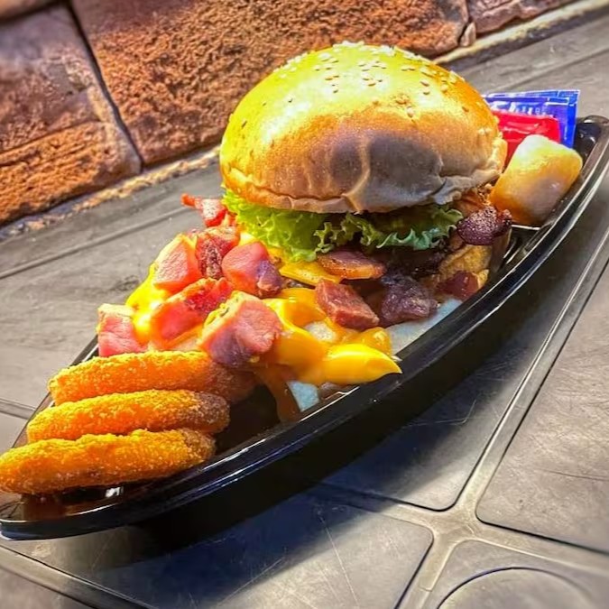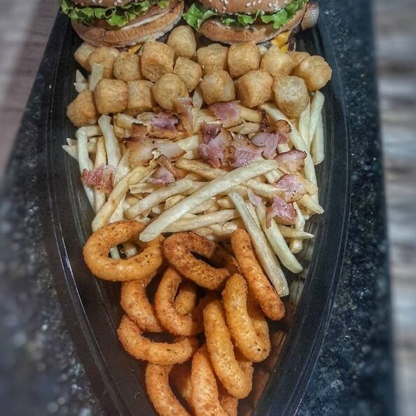 * 2 Burguer a sua escolha + 300g batata frita + bacon + 150g onions rings+150g mandioquinha + molhos