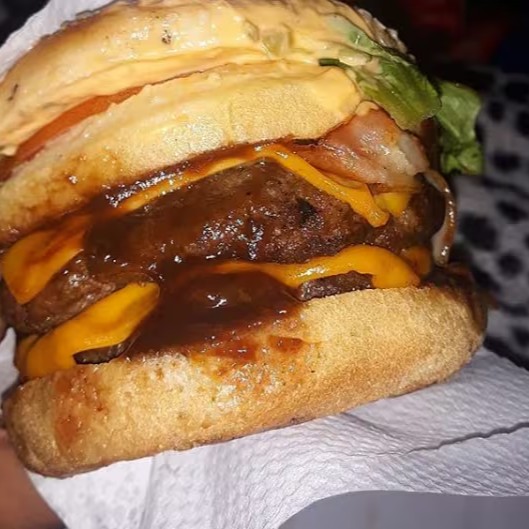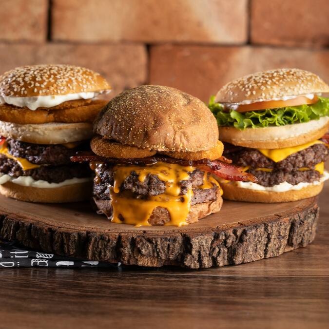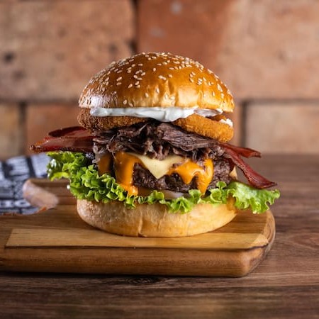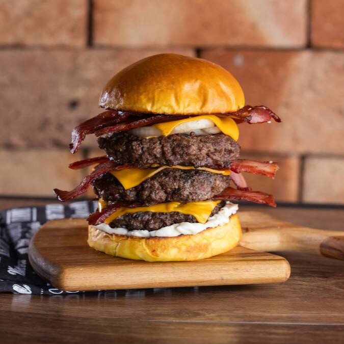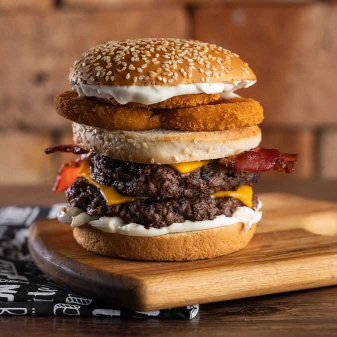 Pão Brioche selado, molho da casa, 3x blend bovino 150g, 3x queijo cheddar, 3x bacon, cebola marinada e molho barbecue