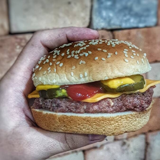Um hambúrguer 100g, queijo cheddar, picles, cebola, ketchup, mostarda e pão com gergelim.
