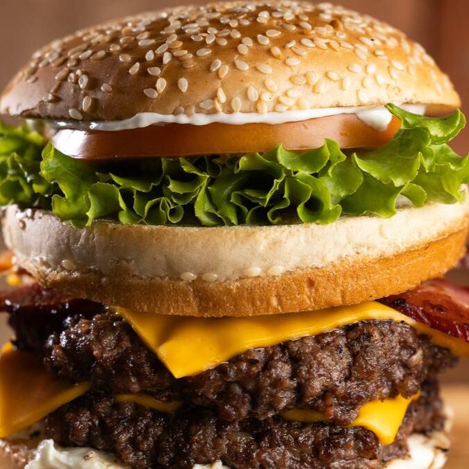 Pão com gergelim, 2x blend bovino 100g, bacon, queijo cheddar, salada, molho da casa, molho sublime e barbecue