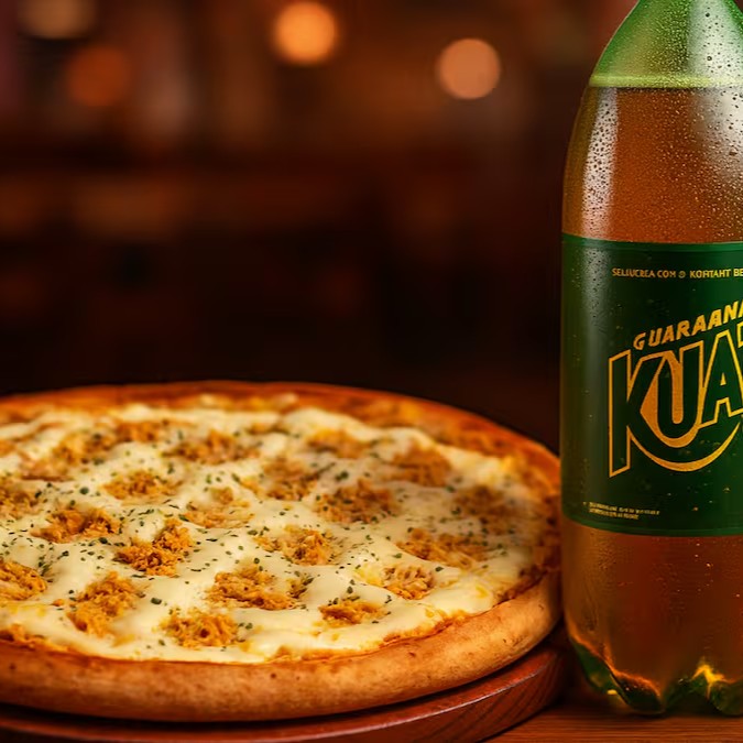 Pizza gigante de frango desfiado com cremoso Catupiry, coberta com mussarela derretida e orégano especial. Acompanha Guaraná Kuat 2 litros bem gelado. Aproveite 30% Off por tempo limitado!