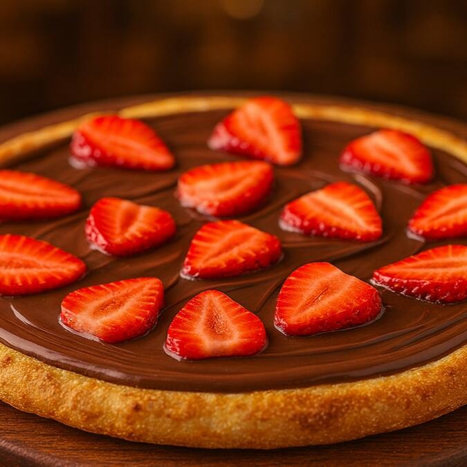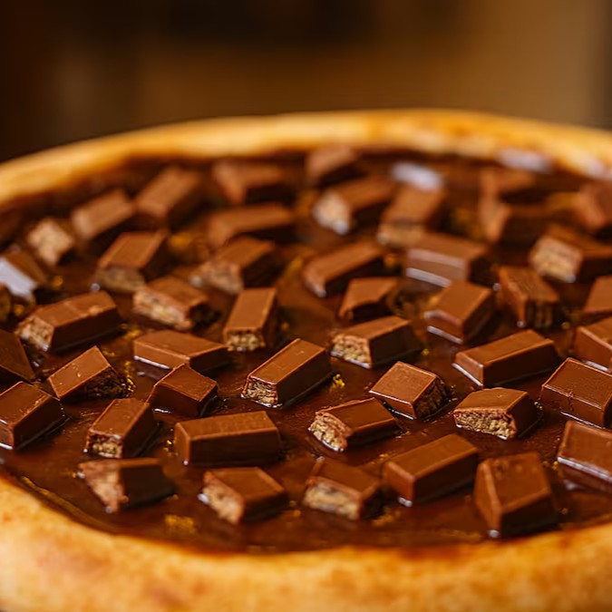 Pizza doce irresistível, coberta com cremoso chocolate preto e finalizada com pedaços generosos de bombom Ouro Branco, para uma explosão de sabor a cada mordida