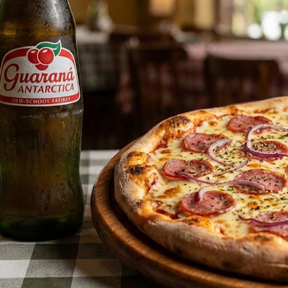Pizza grande de calabresa com 6 fatias, preparada com mussarela derretida, calabresa fatiada e orégano especial. Acompanha Guaraná Antarctica 1 litro bem gelado