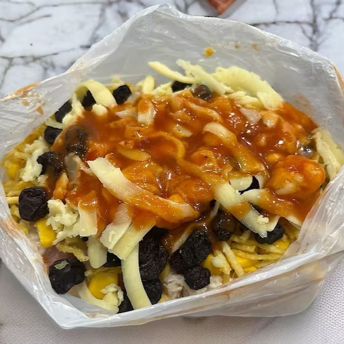 Pão, salsicha, mussarela, milho, batata, passas, maionese, ketchup e molho verde.