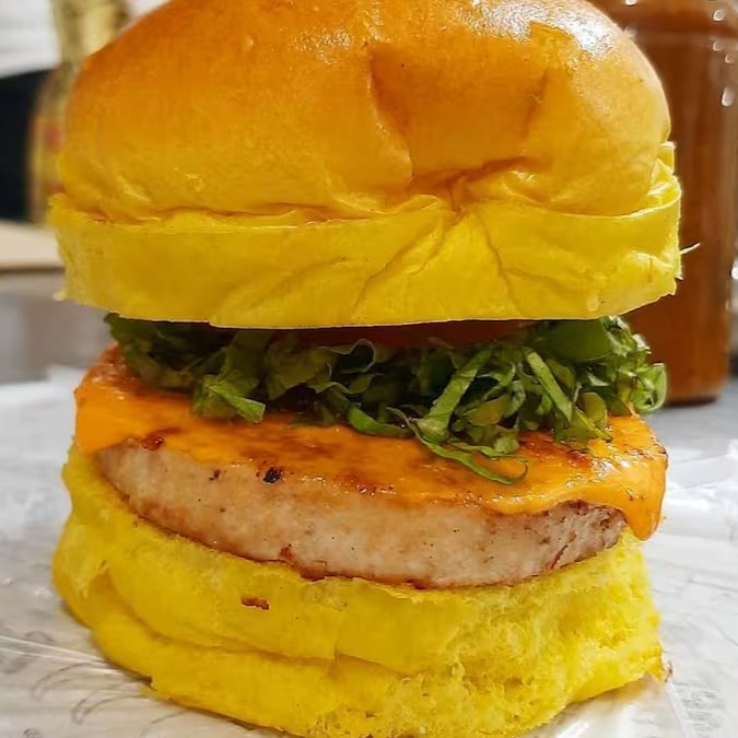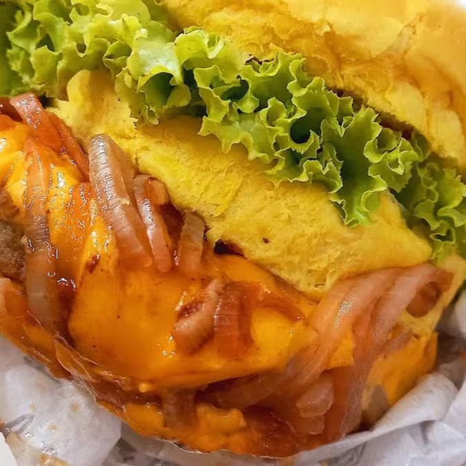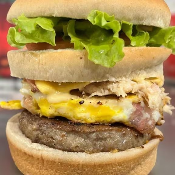 Pão artesanal, hambúrguer de frango 120g, queijo prato, molho especial, salada .