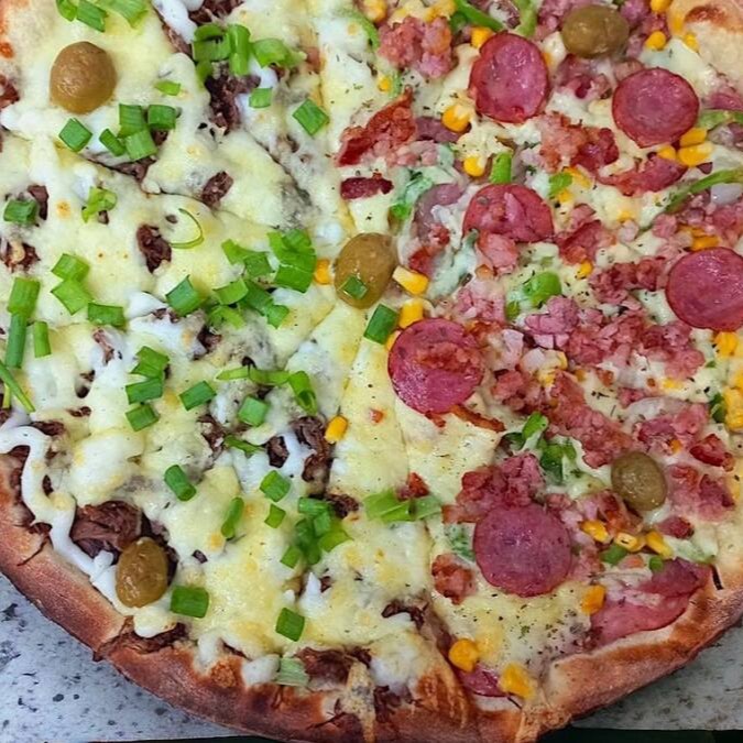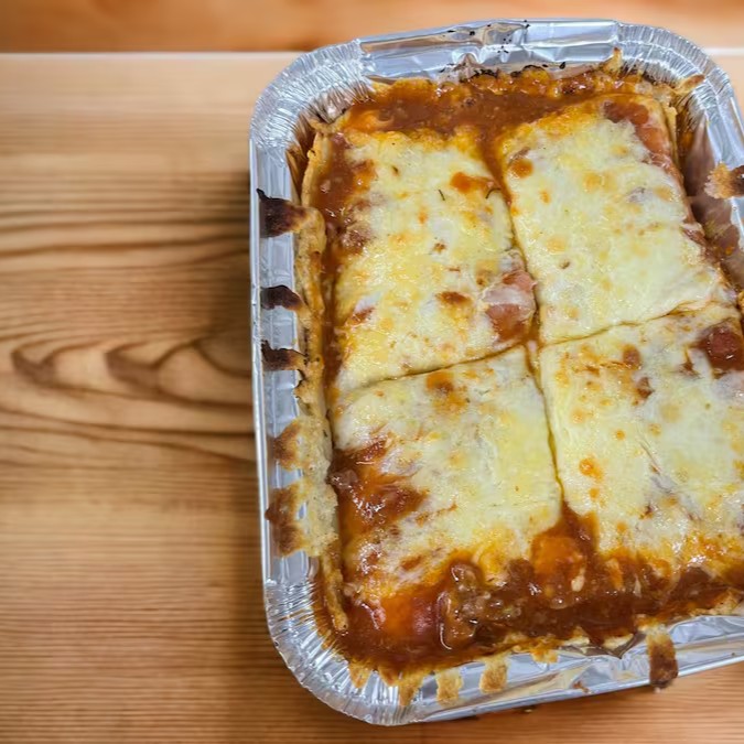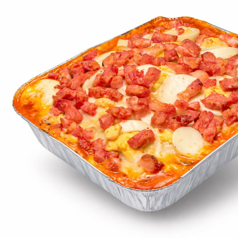 (Peso total -+ 1kg) 3 camadas de massa de lasanha, presunto,mussarela e molho a bolonhesa.