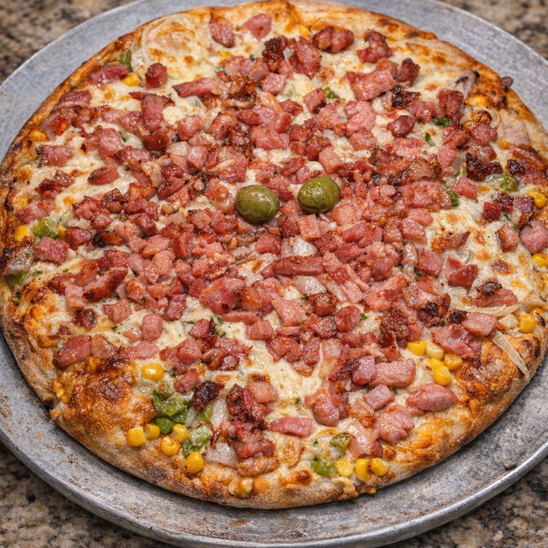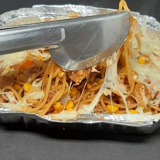 (Peso total -+ 1kg) 400g de espaguete +frango desfiado+milho+ bacon+cebola+pimentão +mussarela por cima