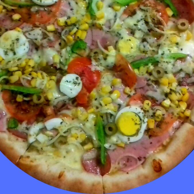 Mussarela, presunto, calabresa, molho, tomate, pimentão, orégano, cebola, azeitona e ovo