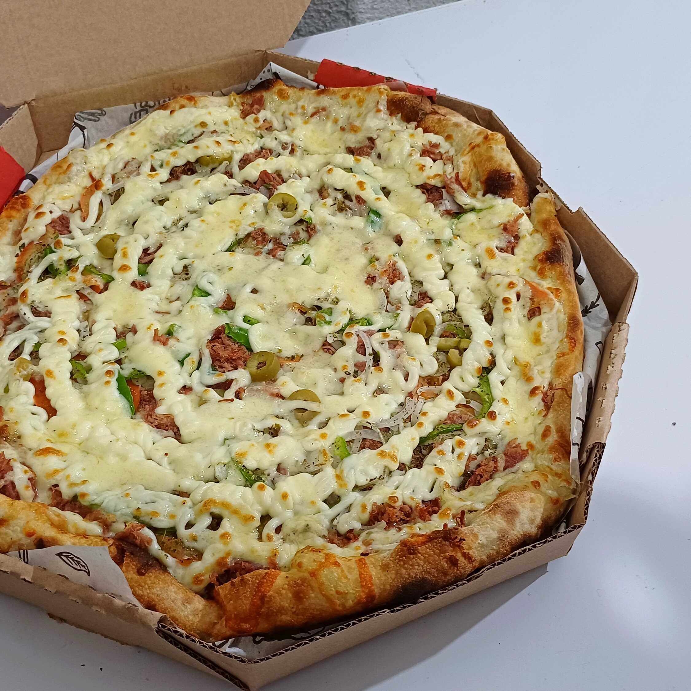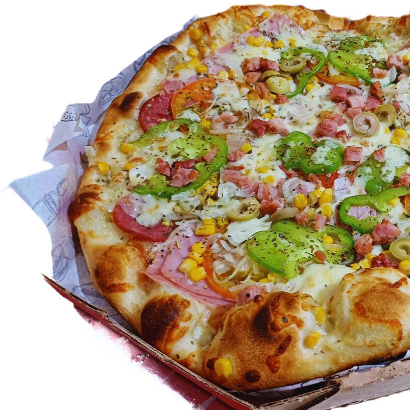 Mussarela, presunto, molho, tomate, pimentão, orégano, cebola e azeitona.