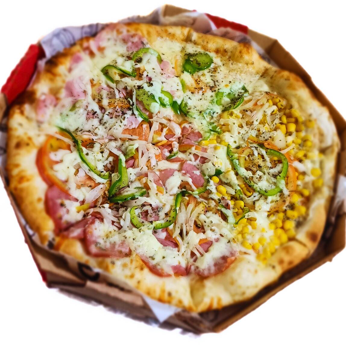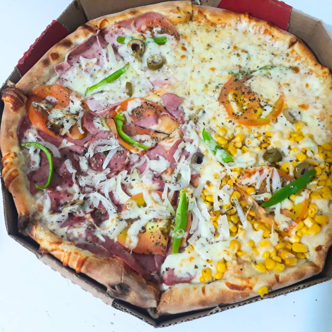 Mussarela, presunto, lombinho, calabresa, passas, milho, tomate, cebola, pimentão e orégano.