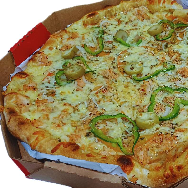 Mussarela, tomate, molho, frango, pimentão, orégano, cebola e azeitona