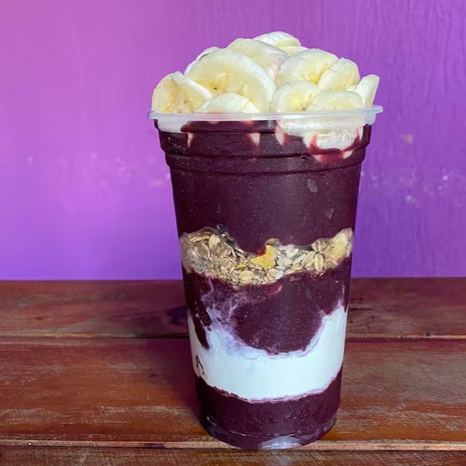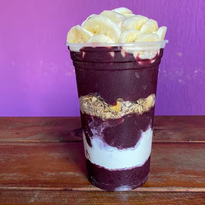 Delicioso açaí no copo com acréscimos de. Leite em pó (da melhor qualidade), Granola (da melhor qualidade) e deliciosos pedaços de Banana!