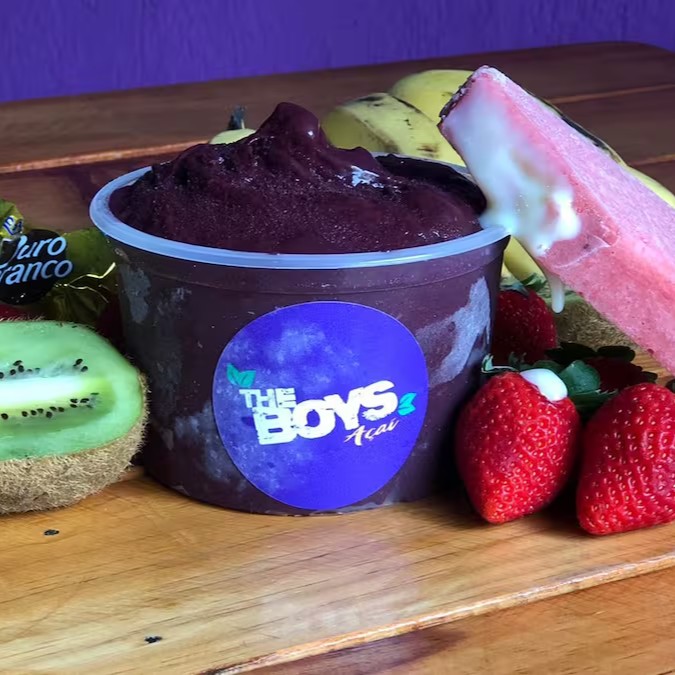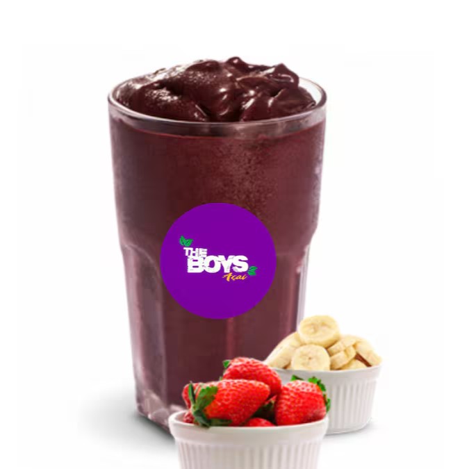 Delicioso açaí gourmet batido com leite, com 1 acompanhamento de primeira qualidade, (frutas são batidas junto ao açaí).