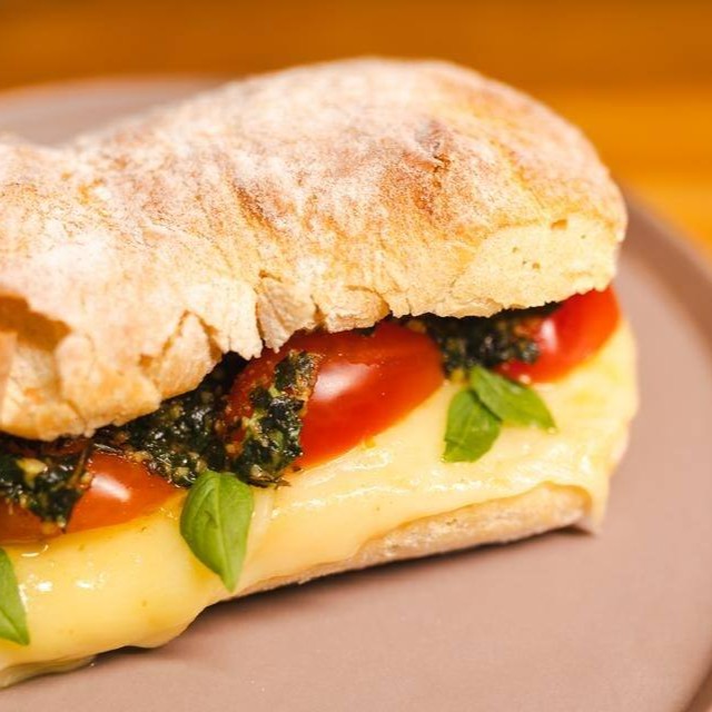 Mussarela, tomate e molho pesto artesanal.