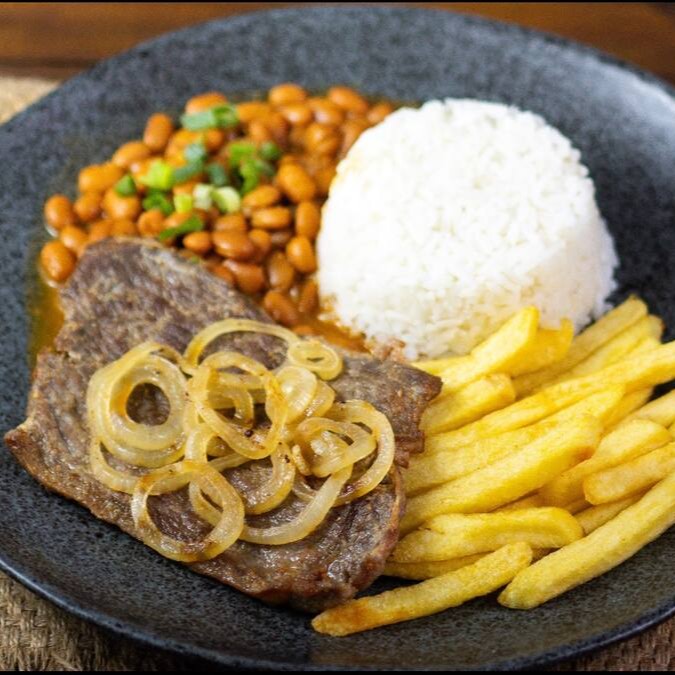 Acompanhamento- Bife de boi acebolado, acompanhado de Arroz soltinho, feijão saboroso, um delicioso macarrão alho e oléo e uma salada fresquinha.