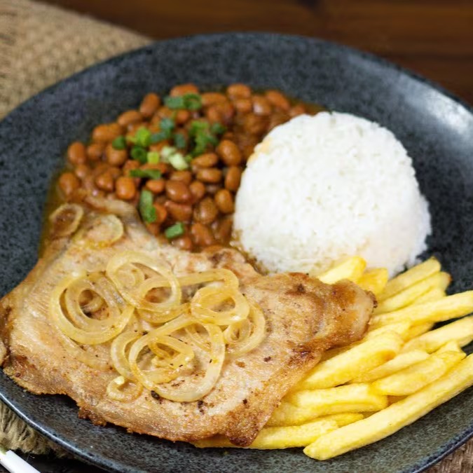 Acompanhamento- Bife de porco acebolado, acompanhado de Arroz soltinho, feijão saboroso, um delicioso macarrão alho e oléo e uma salada fresquinha.