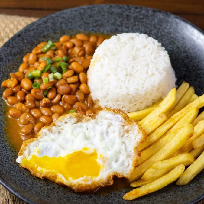 Acompanhamento- Ovo frito, acompanhado de Arroz soltinho, feijão saboroso, um delicioso macarrão alho e oléo e uma salada fresquinha.