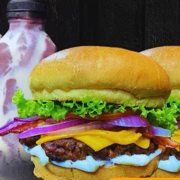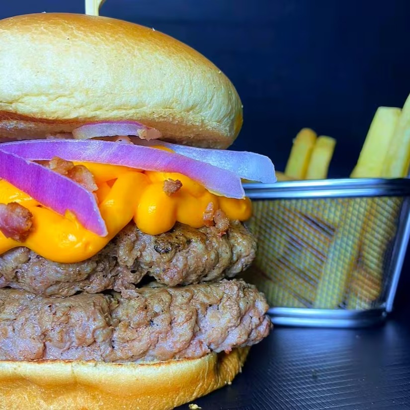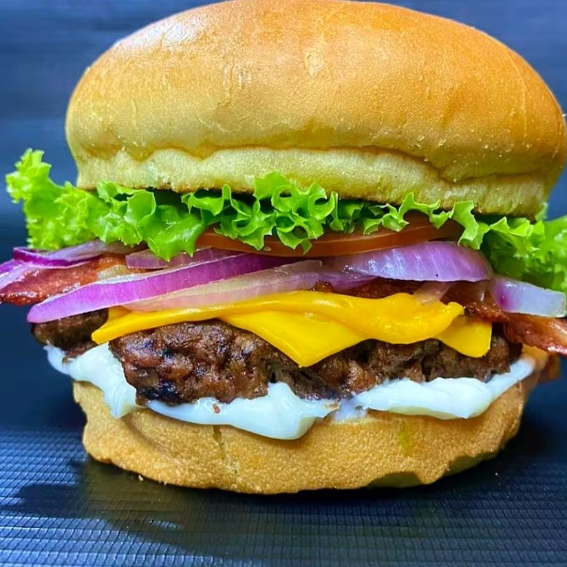Pão de brioche, 2 carne artesanal de 150g, queijo cheddar, bacon, cebola roxa.