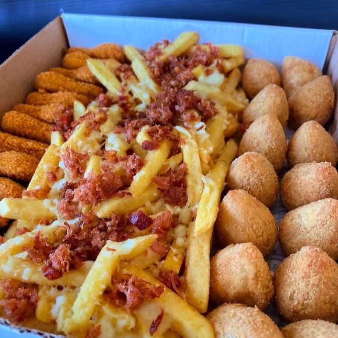 16 coxinhas, 300g de nuggets, 400g de batata com muçarela e bacon e molho especial.