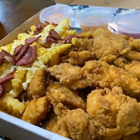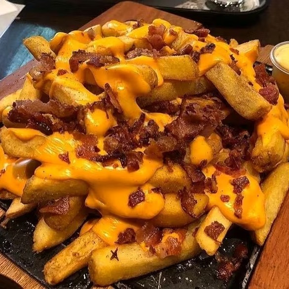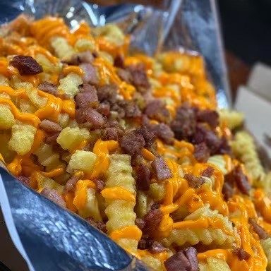 1 Kilo de fritas com cheddar muçarela e bacon acompanha molho.